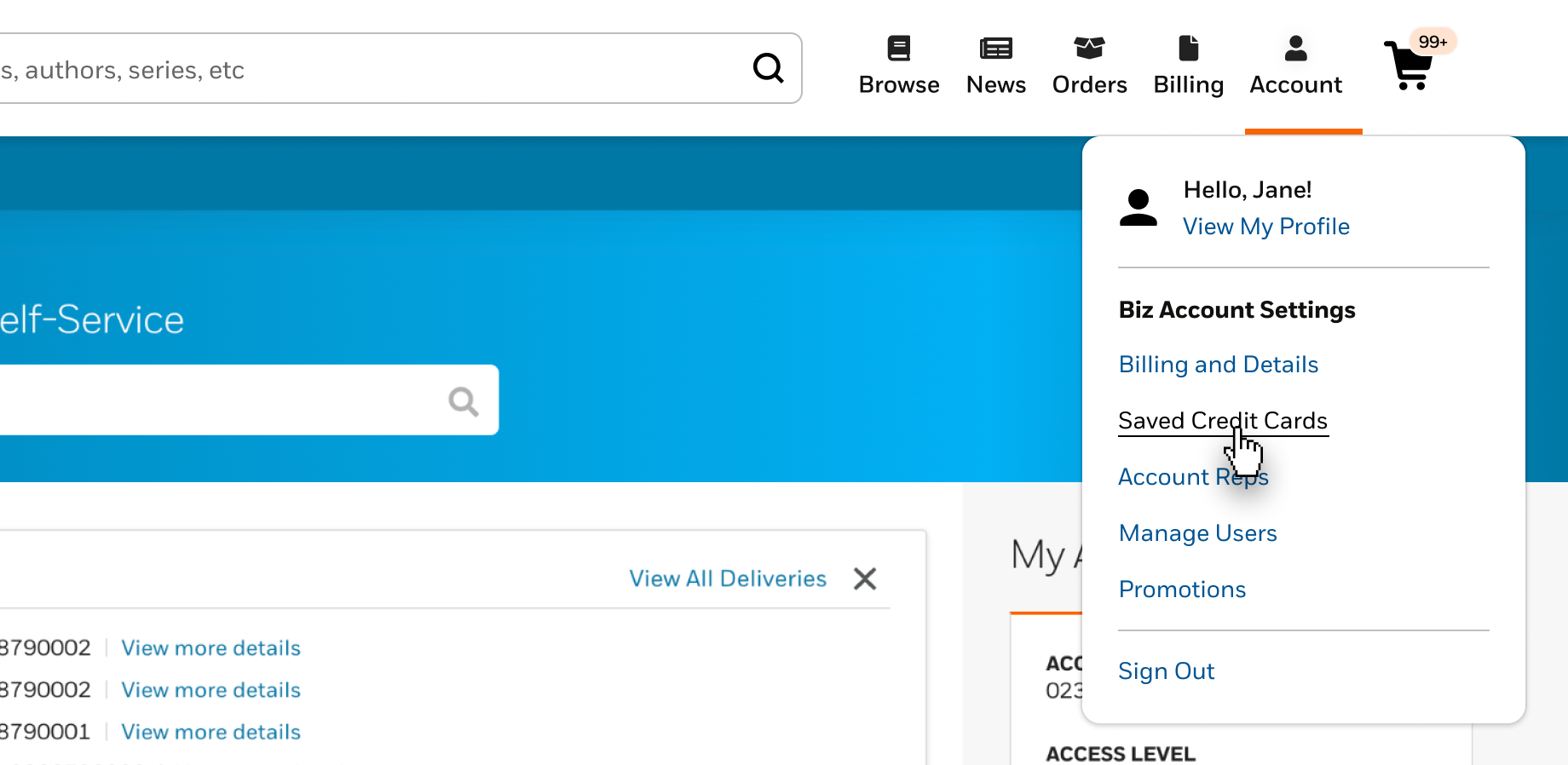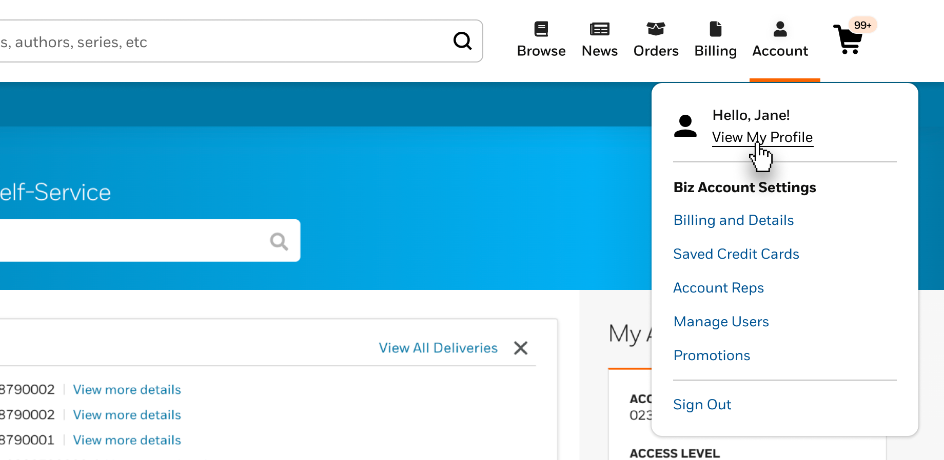 Additionally, along the top right menu and in the footer, there are links to information about Billing and Details, and Account Reps. You can also manage other users on your account, change your password, and view available promotions here.