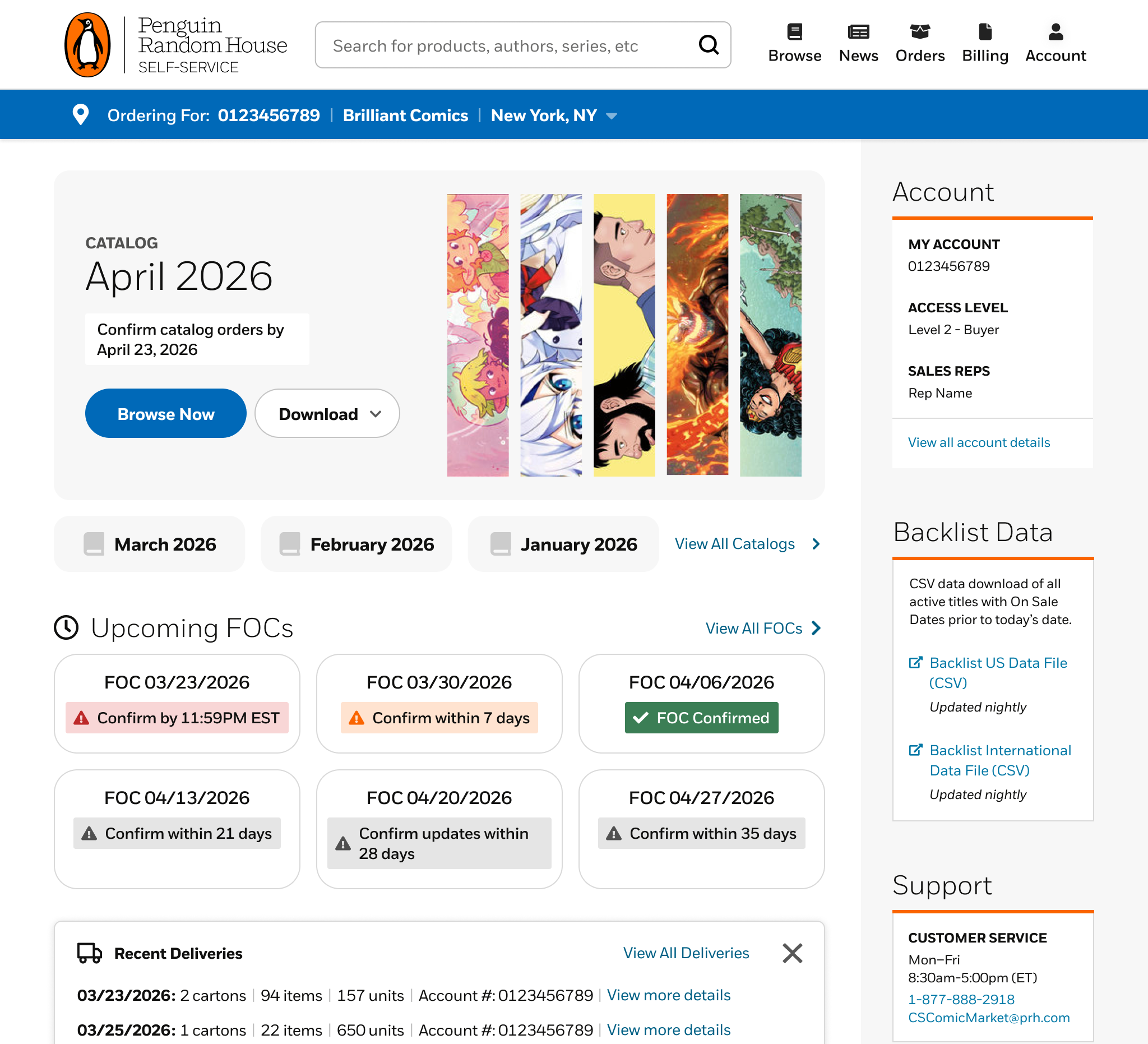 Through the self-service site, you can access to monthly catalogs and weekly FOC pages featuring upcoming comics, graphic novels and manga that can be purchased through Penguin Random House. You can add titles to your FOC carts from the Catalog page, the FOC page, or both.