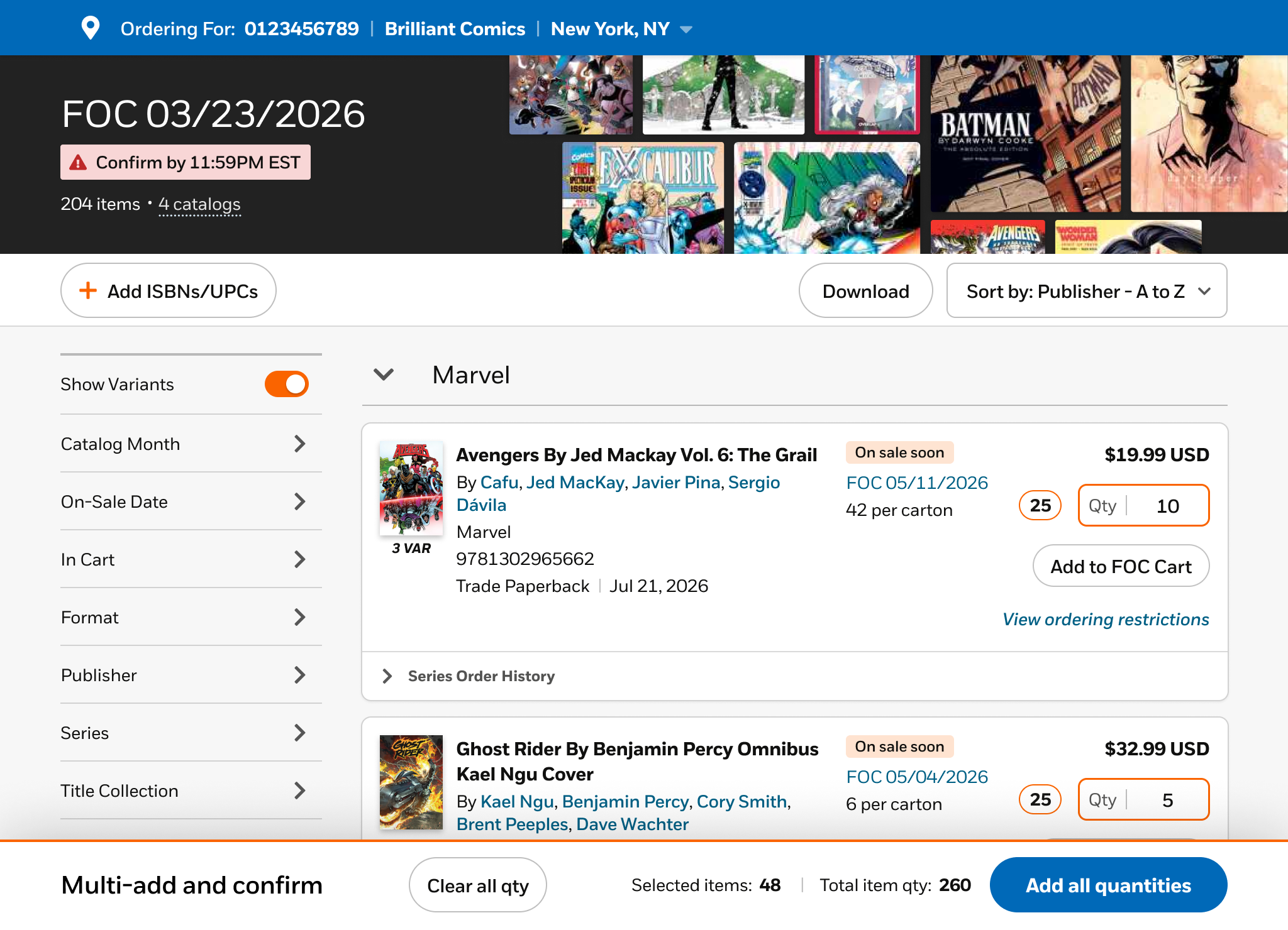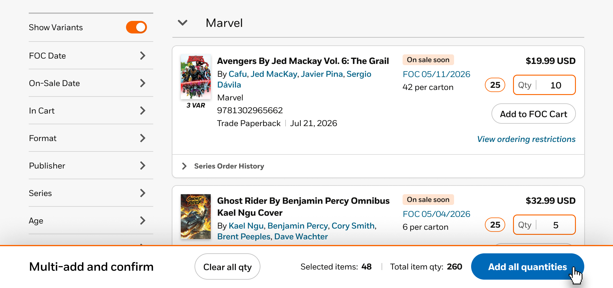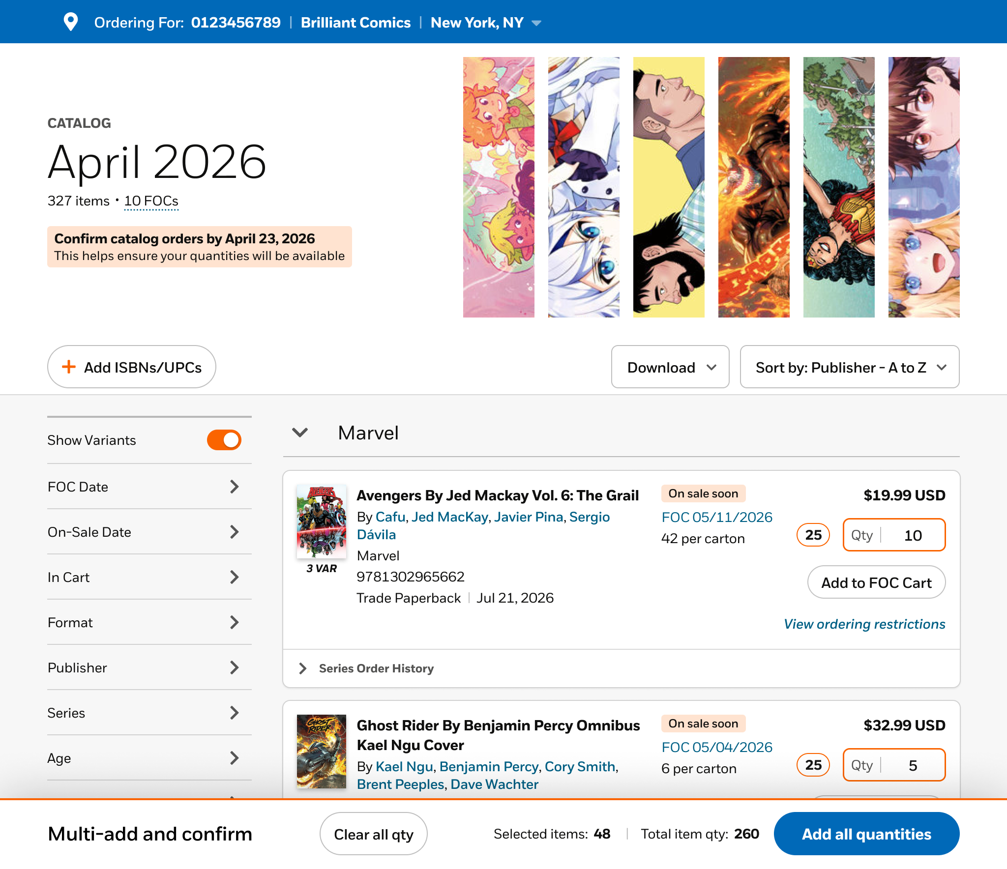 The FOC page functions much like the catalog page. You can add multiple titles using the “Add ISBNs/UPCs” button and use either the Single or Multi-add to Cart options. Quantities entered on this page are also saved automatically, so you can navigate away and return without losing your entries.