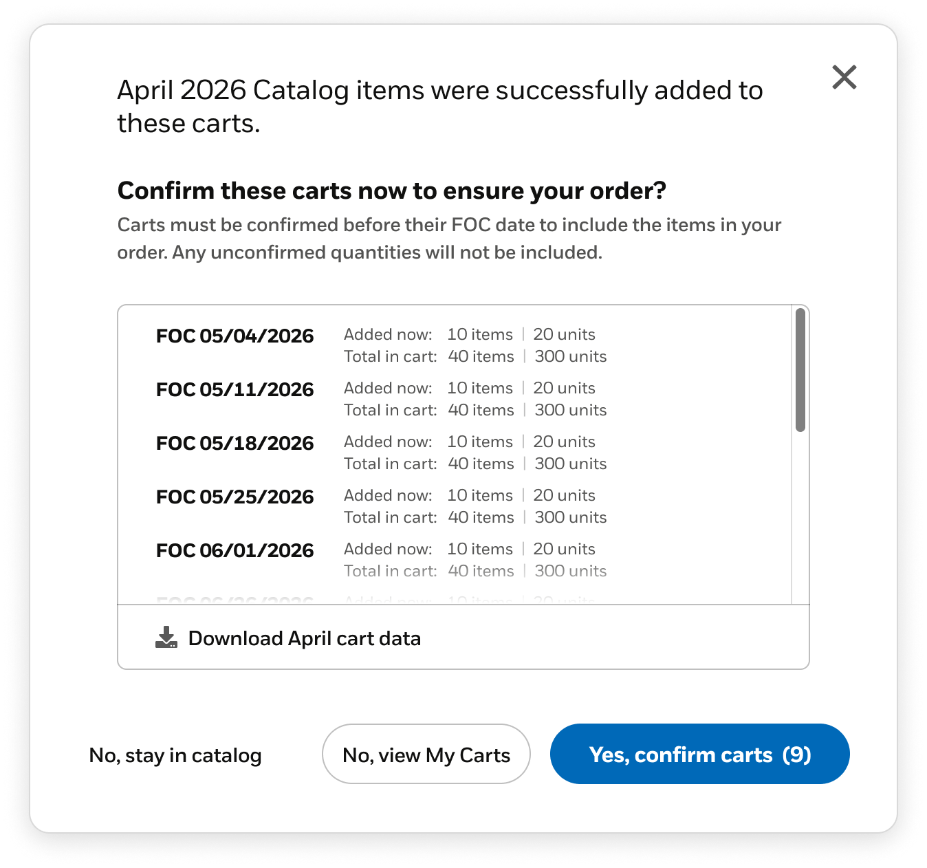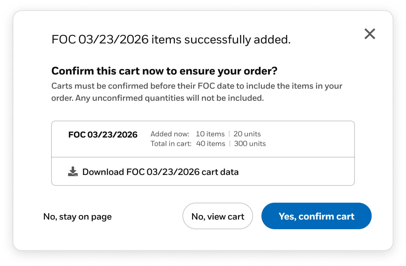 Once quantities are added to your cart from the FOC page you will receive messaging to confirm your cart. You have the option to download your cart data, stay on the page, view the unconfirmed cart, or confirm the cart.