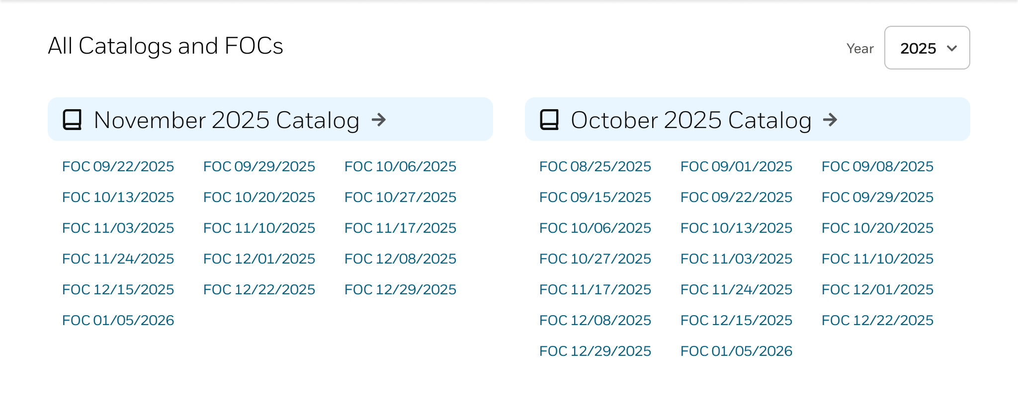 The FOC page includes a countdown to the FOC date and links to the catalogs represented within that FOC.
