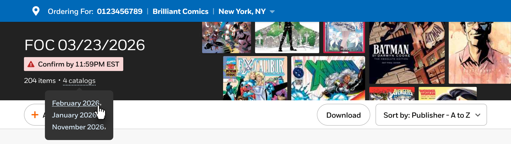 The Catalog Metadata file, Weekly Catalog Delta files, and Cover Image downloads can be found when a user is viewing a particular catalog via the dropdown menu. The FOC title metadata files can be downloaded from each FOC page.